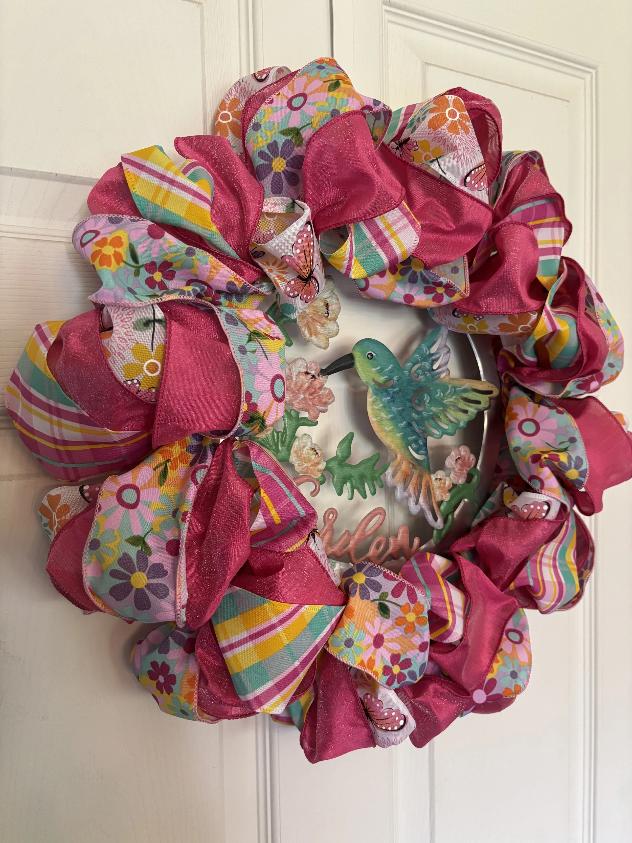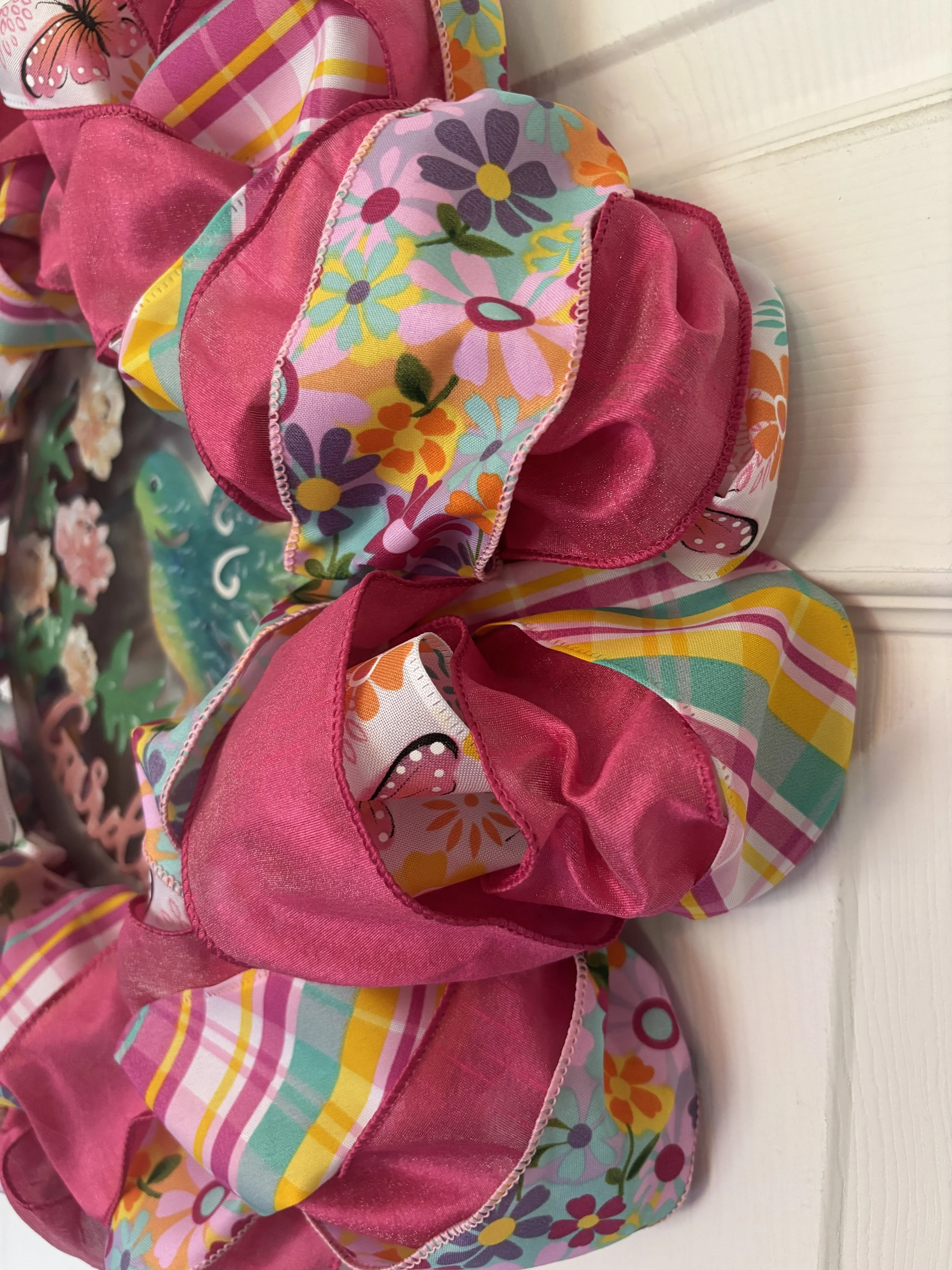 Add some festive cheer to your holiday decor with this 22” ribbon wreath in bright shades of red, green, pink, purple, and teal. Ribbons feature snowflakes, Christmas trees, and candy canes with bows and are accented with shimmery purple and teal as well.